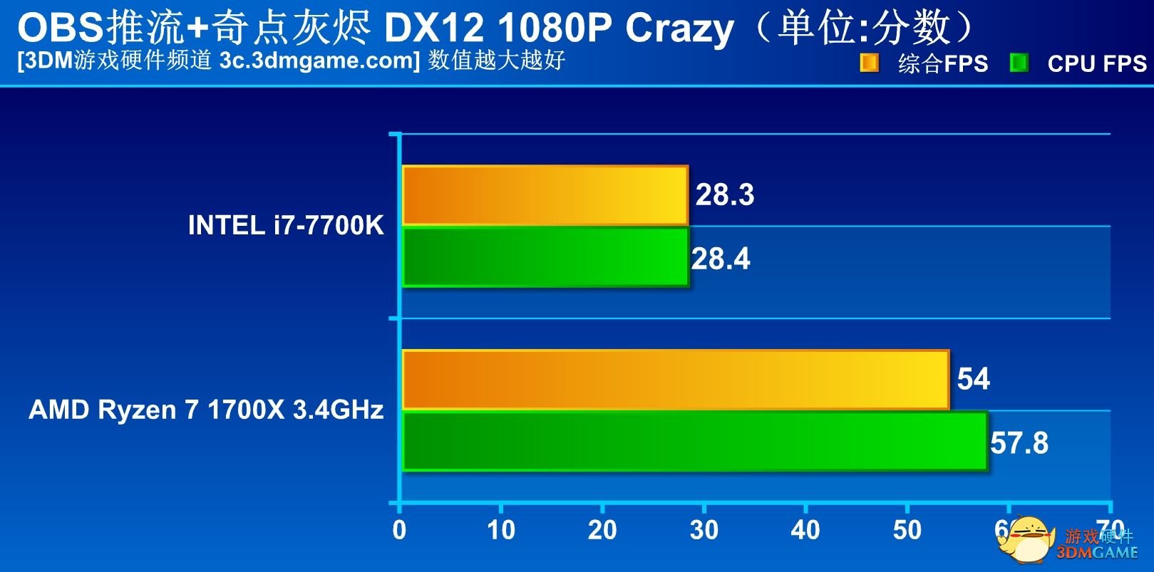 可以看到锐龙 AMD Ryzen 7 1700X处理器同样发挥出色,而7700K最低FPS差点就掉到了流畅线30帧以下,要知道,你的直播有很多网友在看,如果游戏卡顿,势必会照成人气的下降!而锐龙 AMD Ryzen 7 1700X处理器极低的售价却能达到如此好的成绩,性价比不言而喻!