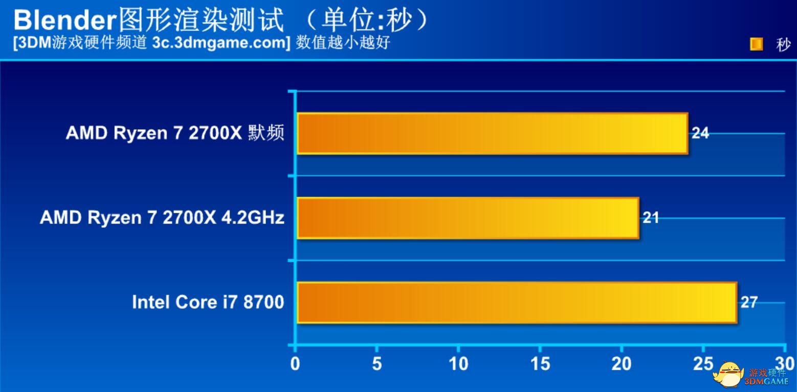 根据测试结果,Intel和AMD处理器默频/4.2GHz分别渲染时间为27.3秒、24.2秒、21.3秒,显然锁定全核4.2GHz的AMD Ryzen7 2700X大幅度胜出,领先Intel i7 8700百分比为28.1%,而近1/3的效率提升在工作中可不是开玩笑的。