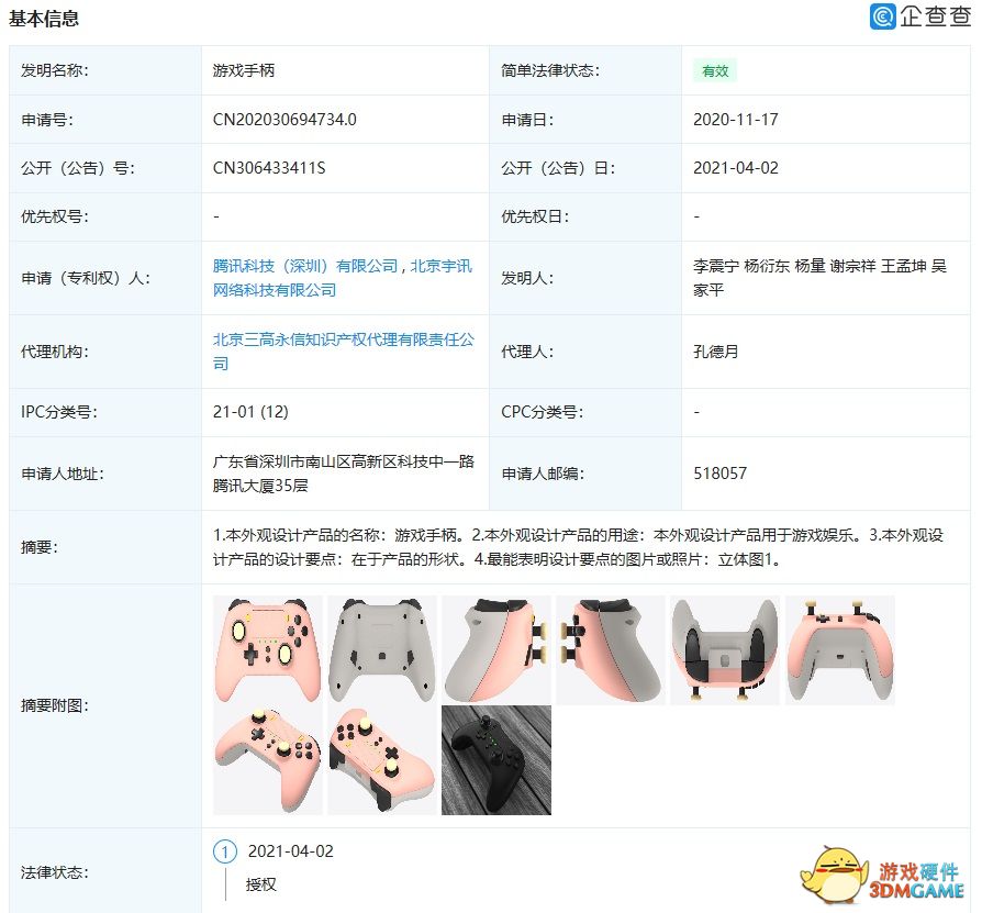 企查查 App 显示,4 月 2 日,腾讯科技(深圳)有限公司、北京宇讯网络科技有限公司一项名为 “游戏手柄”的专利被授权公开,申请日期 2020 年 11 月,公开号 CN306433411S。企查查专利摘要显示,该外观设计产品用于游戏娱乐,设计要点在于产品的形状。