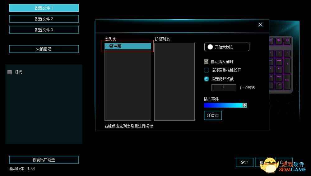 步骤一:打开驱动,选中雷柏V700RGB合金版的宏编辑,点击“宏编辑器”,再点击右下角的“新建宏”,命名为“一键冲跳”。