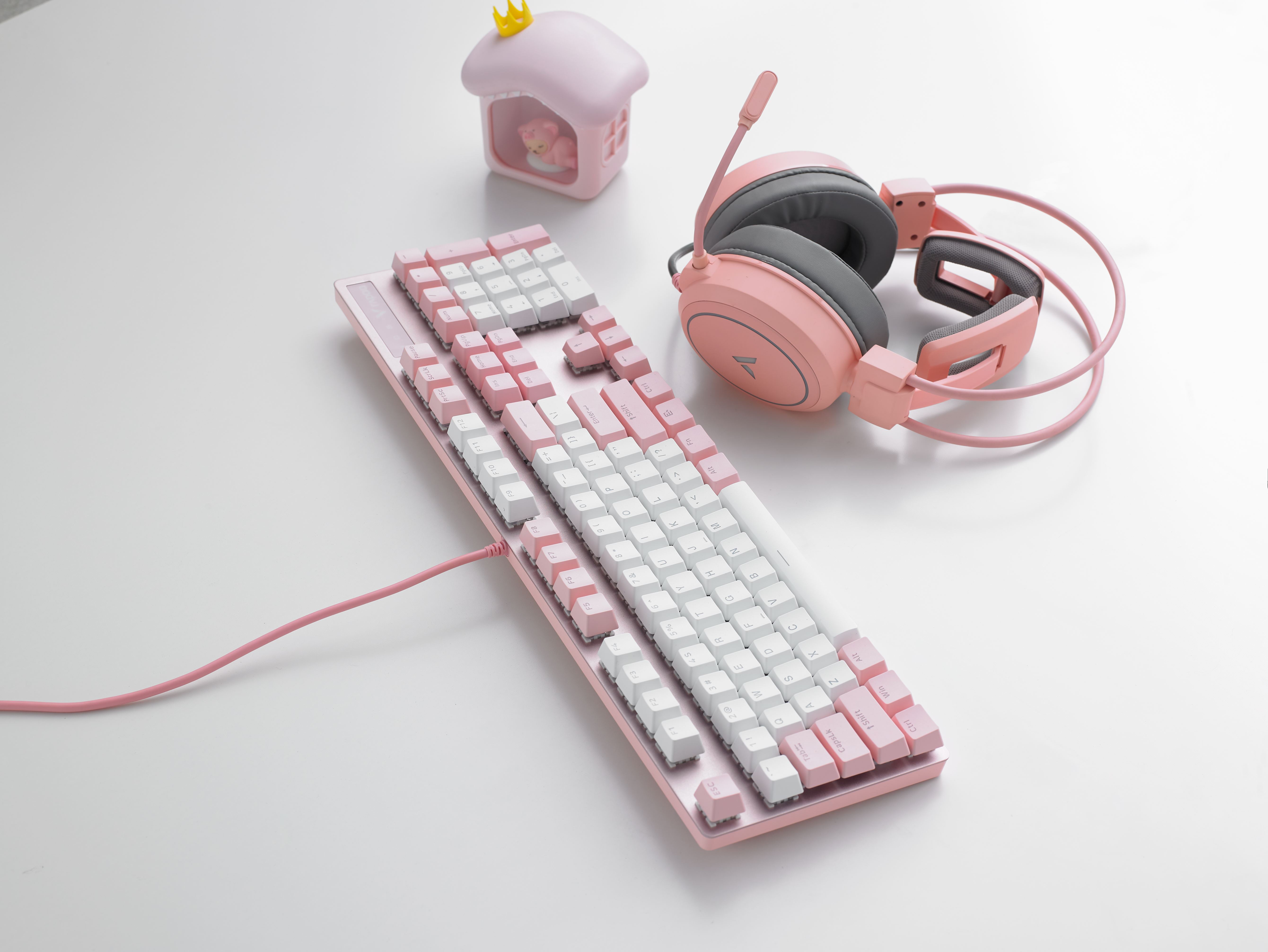 ALL PINK游戏外设桌搭推荐:雷柏V500PRO冰激凌粉游戏机械键盘+雷柏V28S冰激凌粉游戏鼠标+雷柏VH610清滢粉游戏耳机