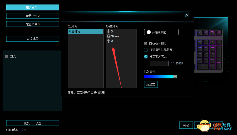 设置低延迟连发操作,需要将默认的攻击X键触发延迟降低,这样就能达到比系统设置的攻击指令触发更快,更好的达到你的面板攻击速度。下面就为大家讲解如何通过雷柏V700RGB合金版的宏定义降低连发攻击触发延迟。