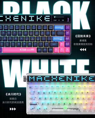 机械师KT68智慧屏版将超时代智慧屏与轻复古打字机重组结合。提供2种配色可选,赛博黑与探索白,满足不同风格的桌搭需求。68键精简布局,保留完整键盘功能,降低桌面的占用空间。